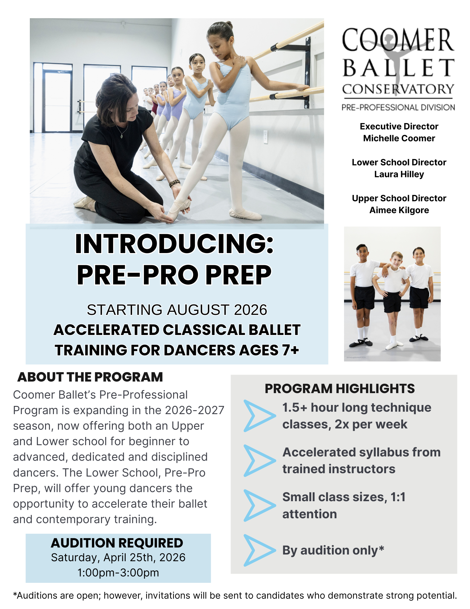 Aimee Kilgore will continue as our Upper School Pre‑Professional Division Director, and we are excited to welcome Laura Hilley as our new Lower School Pre‑Professional Prep Division Director.
